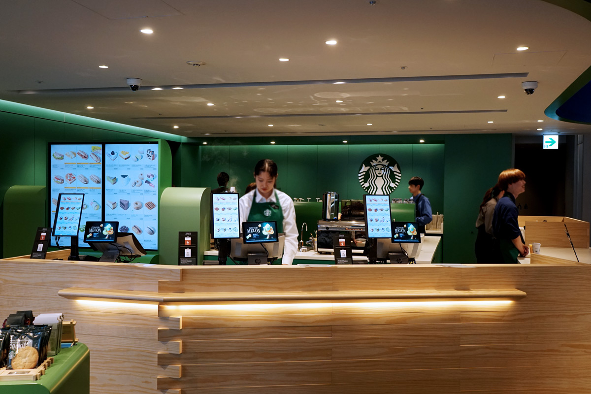 店内はスターバックスグリーンを基調としたグリーンのグラデーションをアクセントにして、カウンターやベンチなどには木材が使われています。シンプル、スタイリッシュ…だけど、どこかほっとする、あたたかい雰囲気。