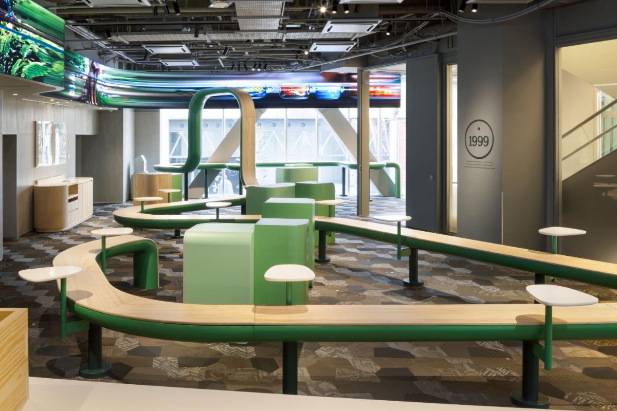 ②「STARBUCKS Green Ribbon」をデザインコンセプトとする、グリーンのリボンが導く、人と人がつながる店舗空間