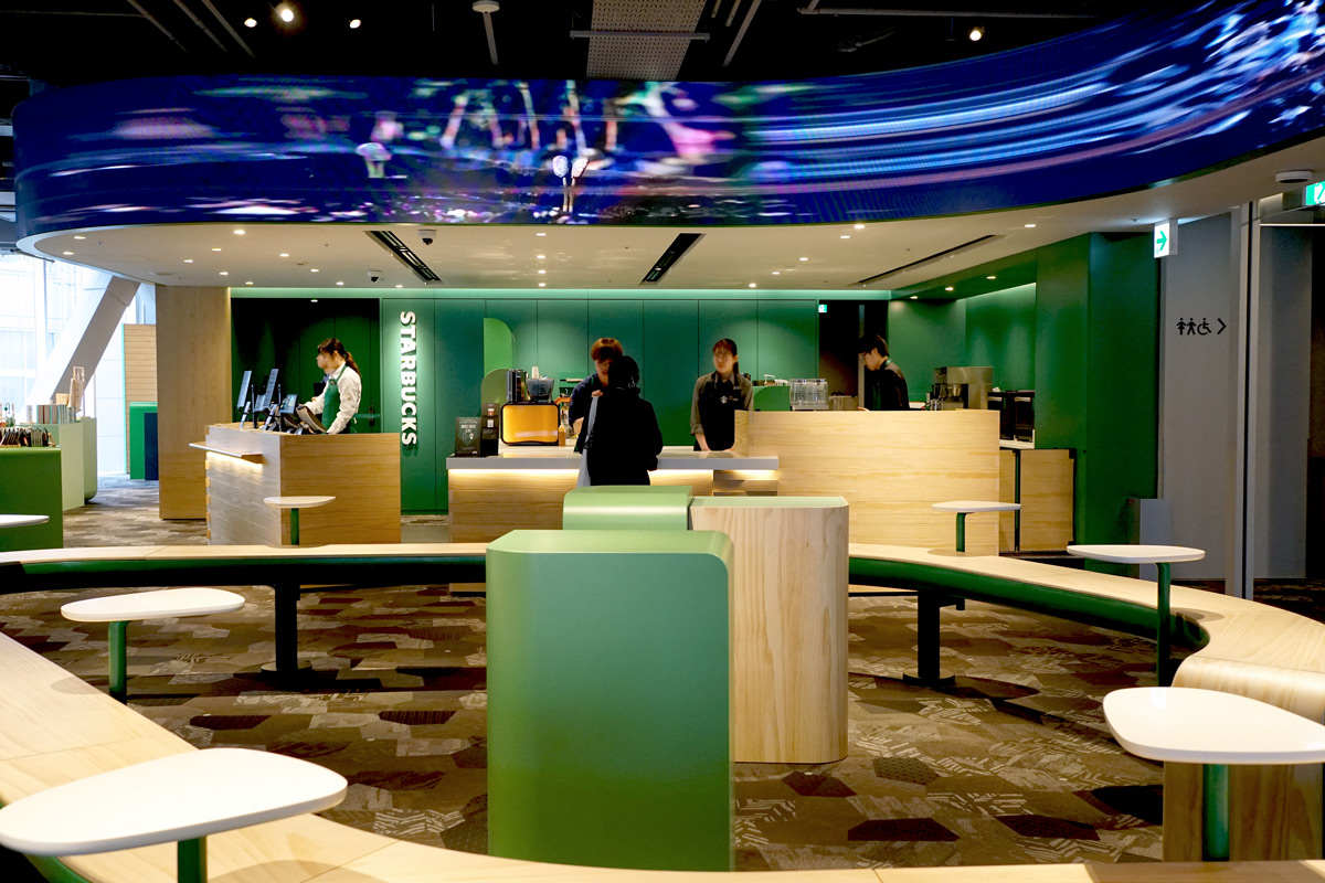渋谷ならではのアートも!天井近くには縦1m×横35mほどの湾曲したサイネージが設置されていて、躍動感のあるデジタルアートを映し出しています。この映像も店舗オリジナル。コーヒー、渋谷の交差点、日本の伝統工芸、渋谷の文化…4つの要素で構成された映像は、はじまりと終わりがないシームレスな造り。変化して、新しいものを生み出しつづける渋谷をイメージしています。