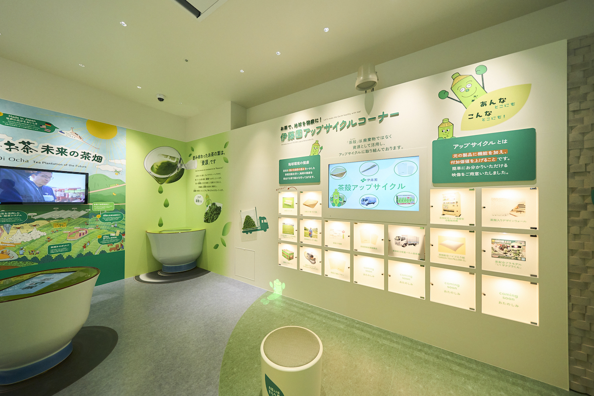 伊藤園では30年以上前から、お茶を入れた際に排出される茶殻を資源として活用しています。畳や段ボールなどアップサイクル商品をパネルで紹介したり、未来への持続可能な取り組みを映像で紹介したりしています。