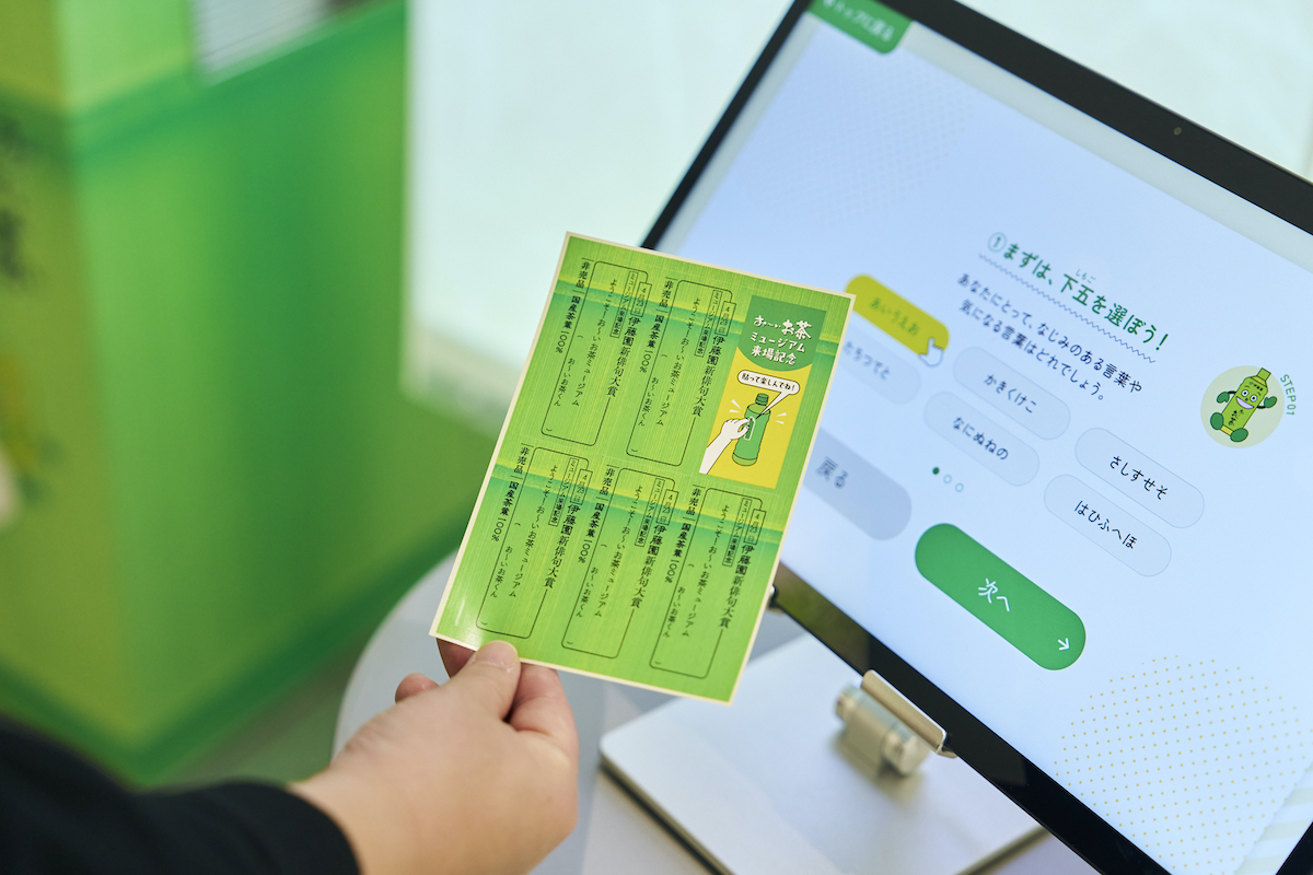 「お~いお茶」のボトルパッケージを見ると、新俳句大賞の入選作品が印字されているのはご存じですか。ここでは、新俳句を創作して、シールに印刷できます。完成したシールは「お~いお茶」に貼って入賞気分を楽しめますよ。このほかにも、「お~いお茶くん」と一緒に記念撮影ができる壁と床を使ったデジタルフォトスポットや、「お~いお茶」の懐かしいパッケージ展示、TVCMの映像コーナーもあります。