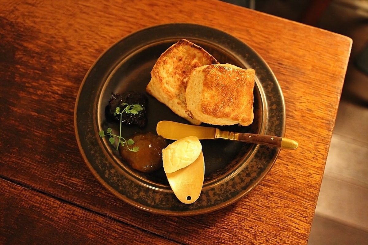紅茶のお供には、ぜひ焼き菓子も一緒にどうぞ。こちらの「スコン」単品760円、「クリームティーセット」1440円は、お客さんの大半がオーダーするというお店の人気メニューの一つ。セットのドリンクは、今月のポットティー(ミルクティorストレートティ)、チャイ、シナモンチャイ、アイスチャイ、アイスティーから選べます。オープン当初からあるメニューで、アプリコットとブルーベリーのジャム、クロテッドクリームが添えられています。