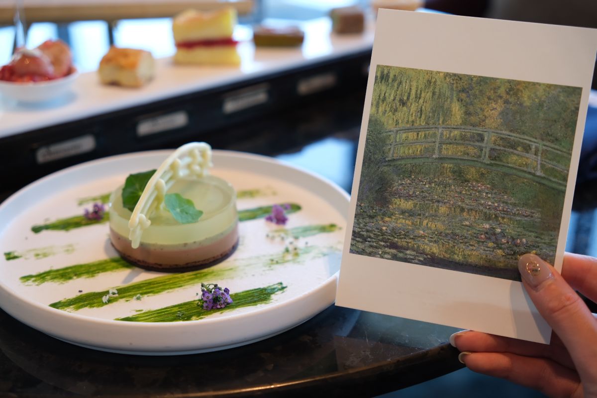 このドリンクは『睡蓮の池』の作品の背景に描かれている草木をイメージしているのだそう。日本の太鼓橋や蓮の葉がトッピングされたメインプレートを手前に置くことで、ドリンクとスイーツで『睡蓮の池』が完成するという仕掛けになっているのだとか。
