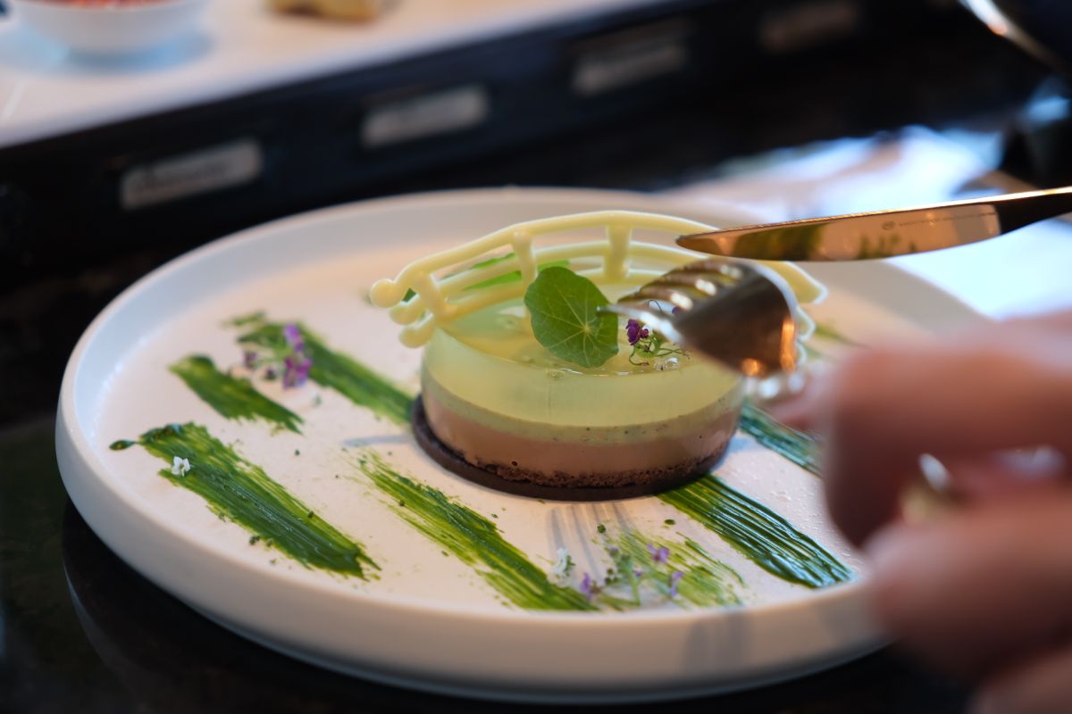 8種のスイーツとセイボリーをいただいた後は、『睡蓮の池』を再現したメインプレートが登場します。鮮やかなグリーンが印象的で、日本の太鼓橋をイメージしたホワイトチョコレートと蓮の葉の飾り付けがアクセントに♪