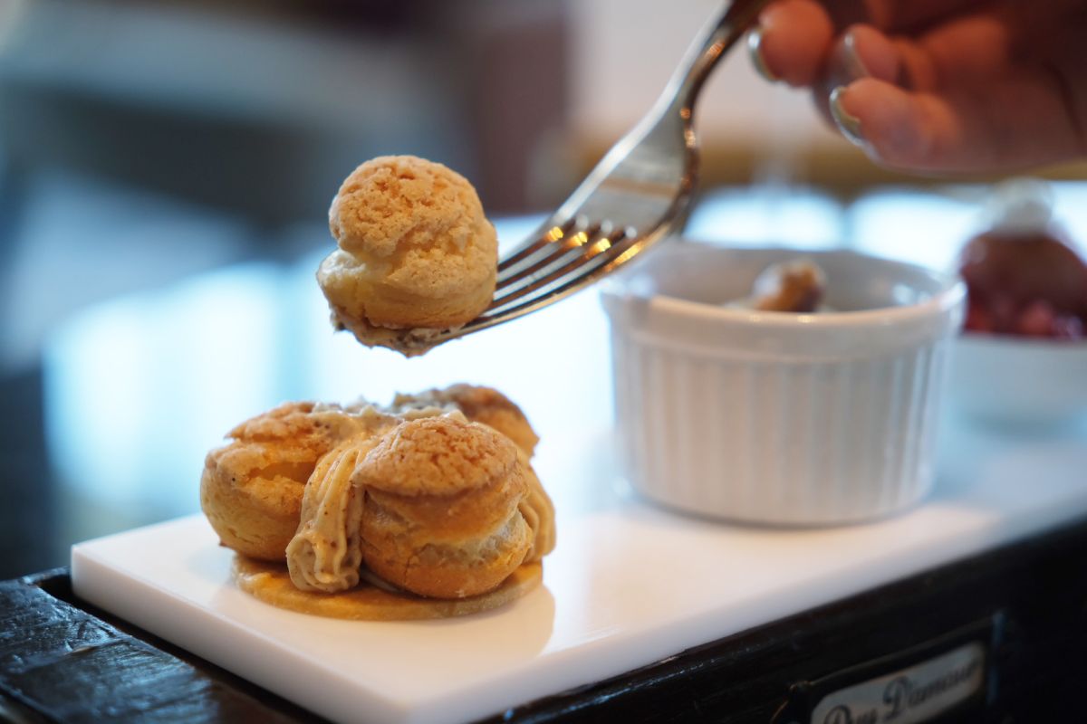 シューをかじると、中からクリームがあふれ、カラメルの甘さとともに口の中に広がります。