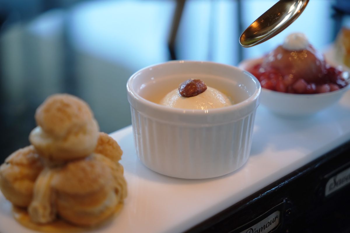ピュイダムールはパイの器の中にクリームをたっぷり絞り、表面をキャラメリゼしたお菓子ですが、メズム東京では、リンゴの芳醇な香りとさわやかな酸味が特徴の、ノルマンディー産のカルヴァドス(蒸留酒)を使用したアイスとして提供されています。