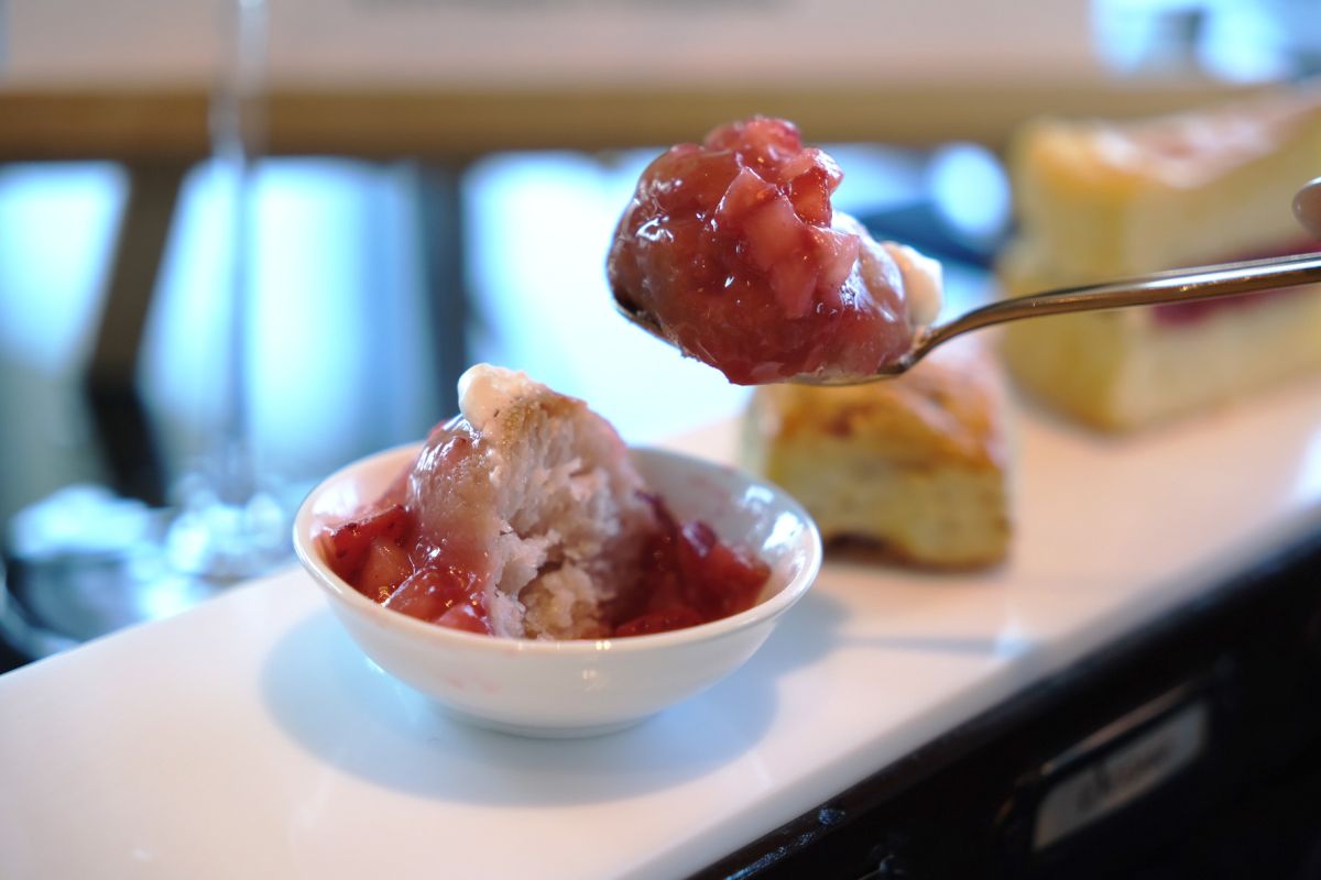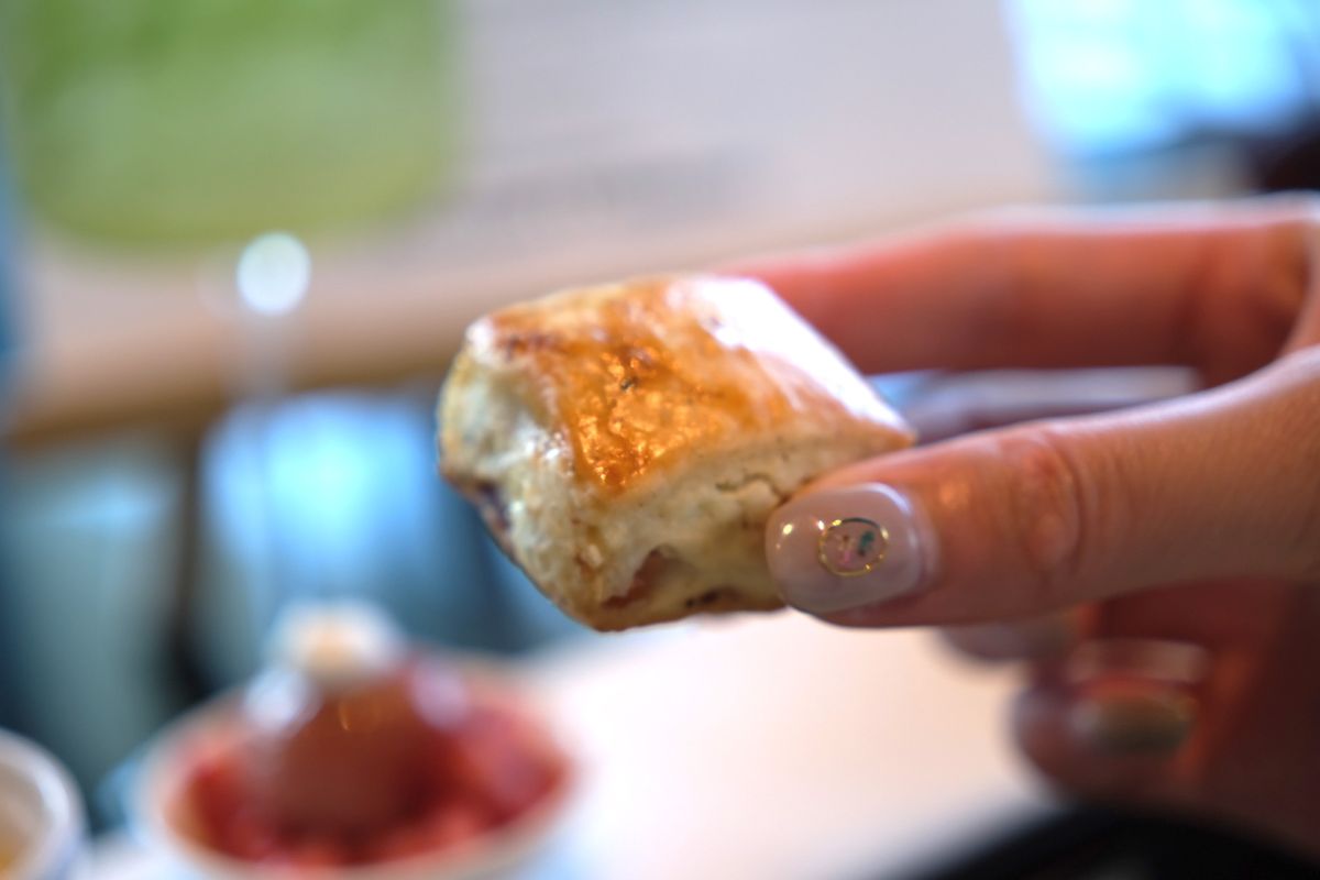 なじみあるスコーンの味を想像して口に入れるとびっくり!生地にベーコンが練りこまれた、しょっぱい系のお食事スコーンでした。ブラックペッパーのピリ辛さが、甘いスイーツの箸休めにもぴったり。