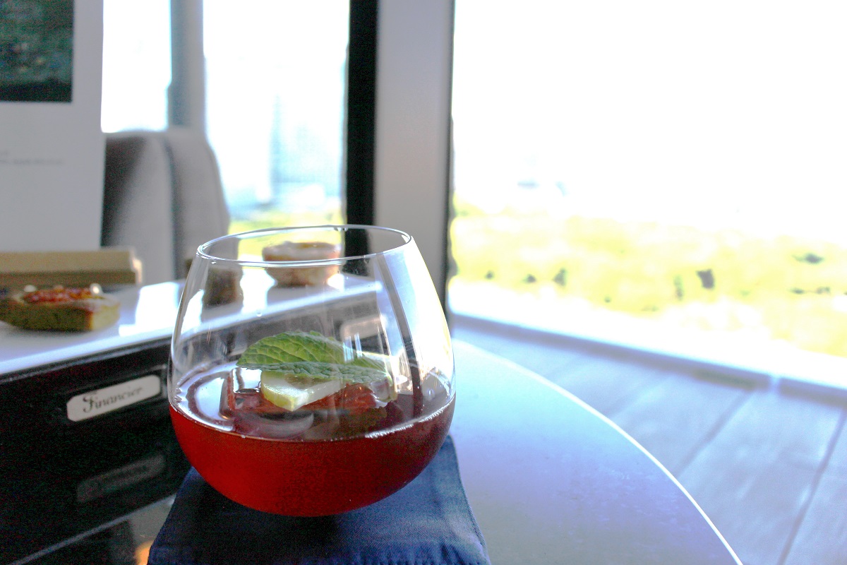 はじめに8種類のスイーツとセイボリーとともに提供されるのが、「サングリア風アールグレイティー」。フランスではフレーバーティーが主流であることから、サングリアシロップを加えたさわやかなアールグレイティーが用意されています。さやわかな味わいで、ミントとレモンのすっきりとした香りが鼻に抜けるドリンクです。