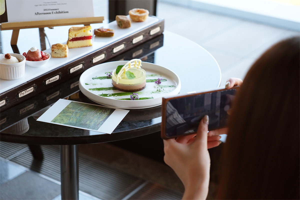 今回は、ポーラ美術館の収蔵作品のなかでも特に人気の高い、クロード・モネの作品『睡蓮の池』がテーマ。「旅の画家」とも称されるモネが過ごした地域や歴史を背景に作り上げた、8種類のスイーツとセイボリー、メインプレートのスイーツも登場します。目にも涼しげな特別なアフタヌーンティーは、これから訪れる初夏から夏のまぶしい太陽の季節にぴったりです♪