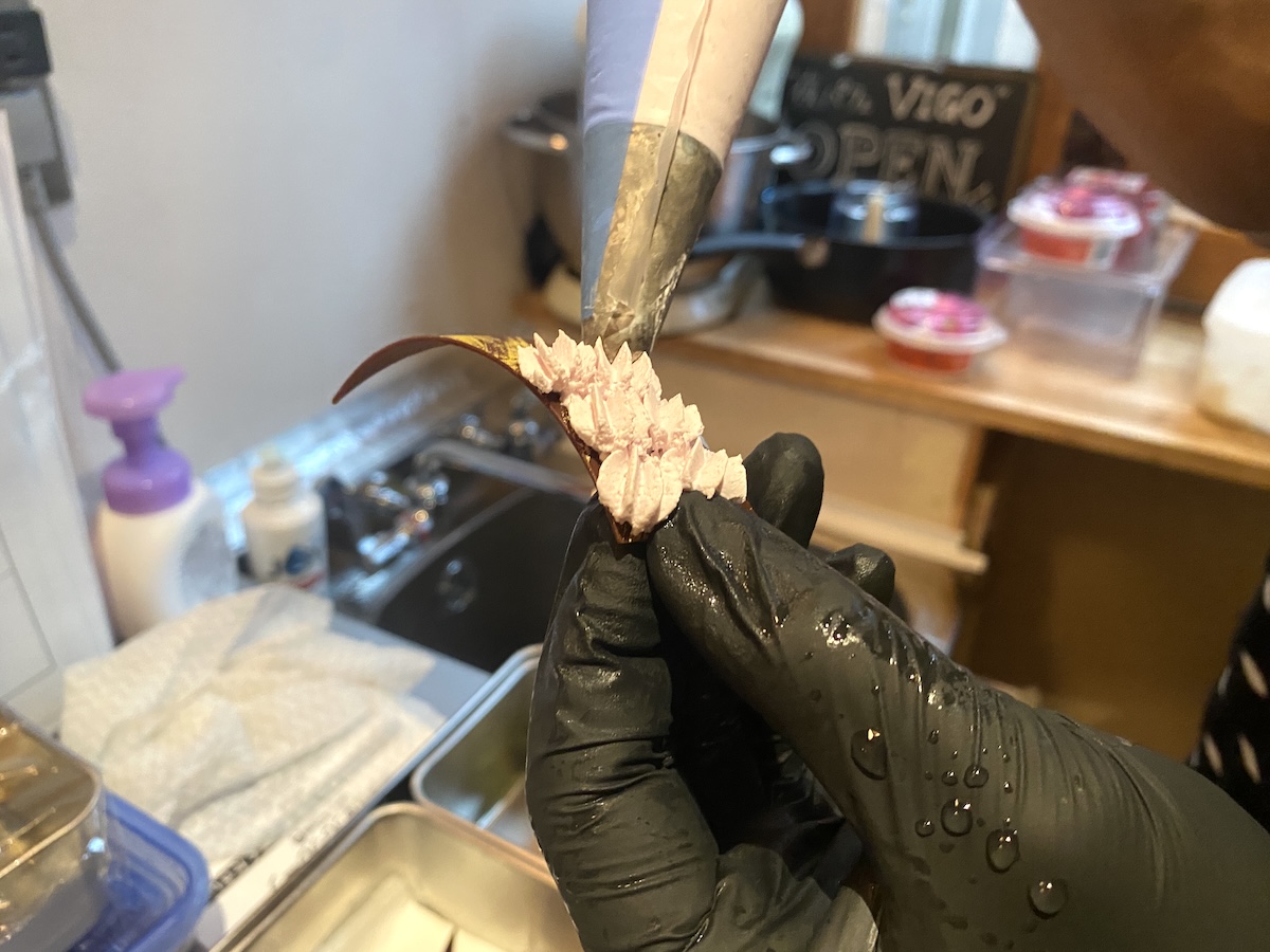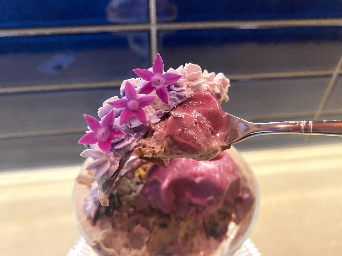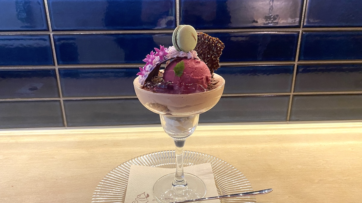 まず紹介するのは「藤」2350円です。4月下旬から5月上旬が見頃の藤の花をイメージして作られたパフェ。日本各地で藤まつりが開催されるほど定評のある藤の美しさを上手く表現しており、特にカシスクリームとエディブルフラワーを使ったトップの装飾はもはやアートです。