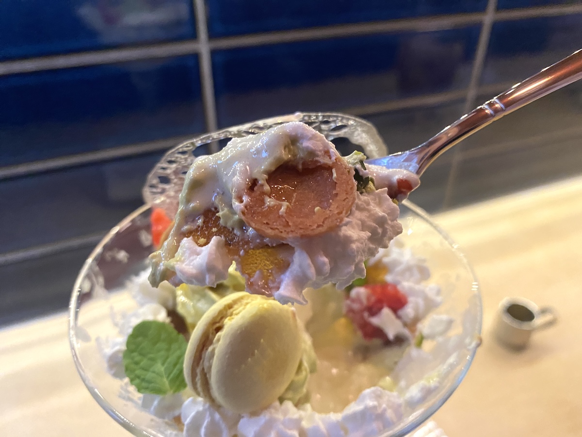 オレンジチュイールをはさんだ2層構造になっていて約13種類のトッピングがされています。上にはレモンシャーベットやレモン&ショウガのマカロン、シナモンサブレなど、下には塩ミルクアイスやピスタチオクリーム、エルダーフラワージュレなどが合わさっていて、全体的にオレンジやレモンなどのすっきりとした味わい。小さなホワイトチョコのミルキーな甘さと塩ミルクアイスの塩気が、酸味を引き立てているのもポイントです。チョコのような甘さよりもフルーティーな酸味を楽しみたい人におすすめのパフェとなっています。