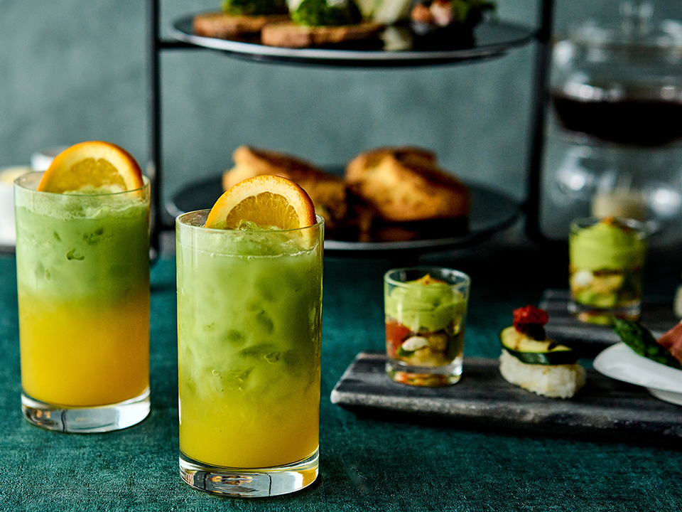 ウェルカムドリンクとして、抹茶の特徴であるビターな風味とオレンジジュースのフルーティーさを掛け合わせた「うすもえぎ」を用意。