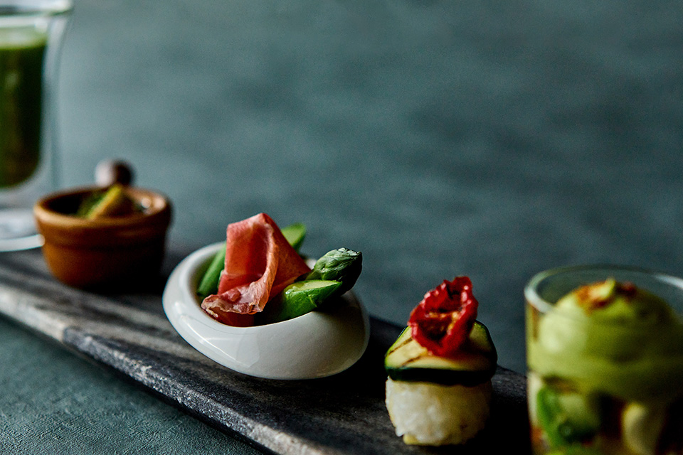 セイボリーは、彩り野菜とモッツァレラのコンソメジュレ、アボカドムースを層にした涼しげでさわやかなグラス前菜や、ガーリックと香草を練り込んだバターの風味が素材のうわ味を引き立てた帆立とマッシュルームのブルギニヨン、ショウガを利かせた酢飯と黒オリーブやアンチョビなどを使ったタプナードをグリルしたズッキーニで巻いた洋風手まり寿司などが並びます。