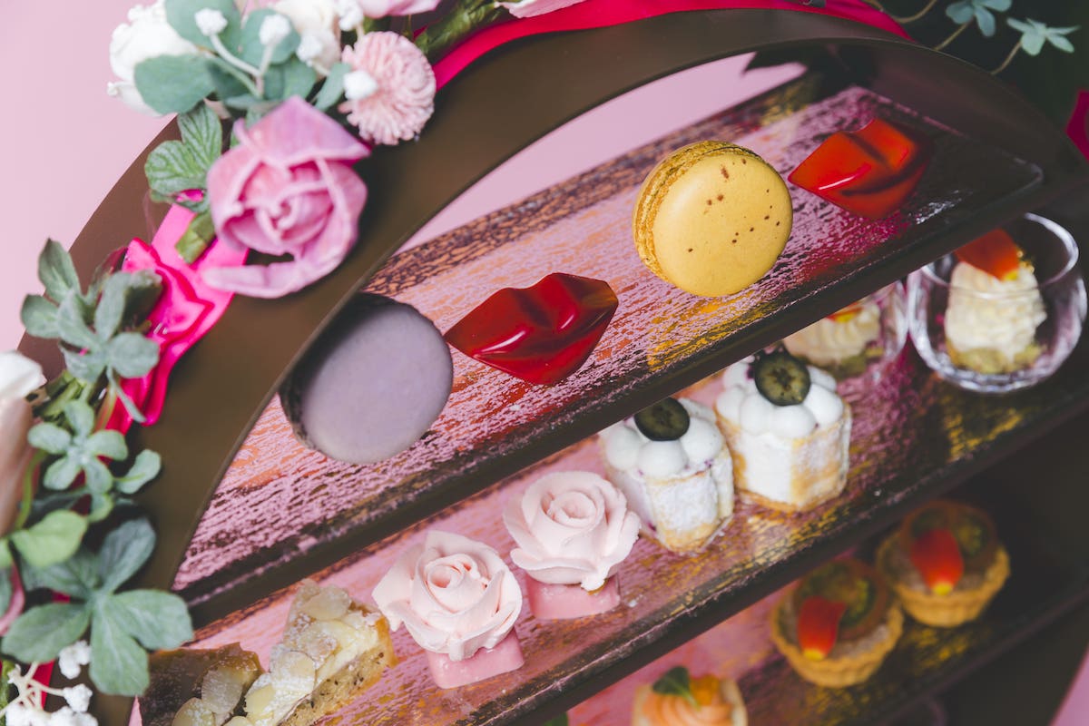 「ローズアフタヌーンティー」では、バラのソラフラワー(ソラの草木でできたシートで作られた花)のアレンジメントが華やかなアフタヌーンティースタンドに、ローズウォーターを使った唇型のボンボンショコラやライチとラズベリーでバラの花を表現したスイーツなど、可憐で繊細なスイーツがずらりと並びます。