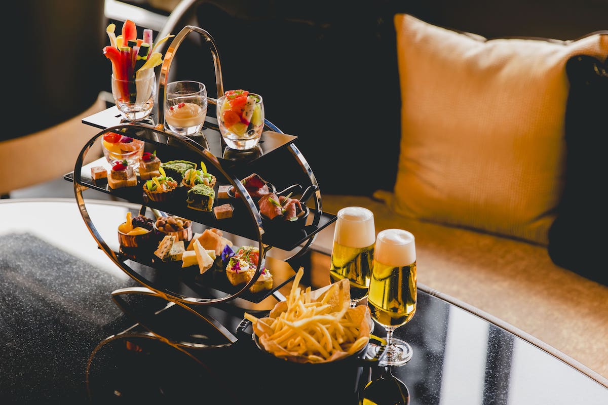 「ル バー フォション」では、2024年5月7日(火)からビアガーデンセットを提供。夜に楽しむ大人のアフタヌーンティーをイメージし、スタンドに並ぶフォションホテル京都特製のフレンチおつまみやポムフリットが並びます。