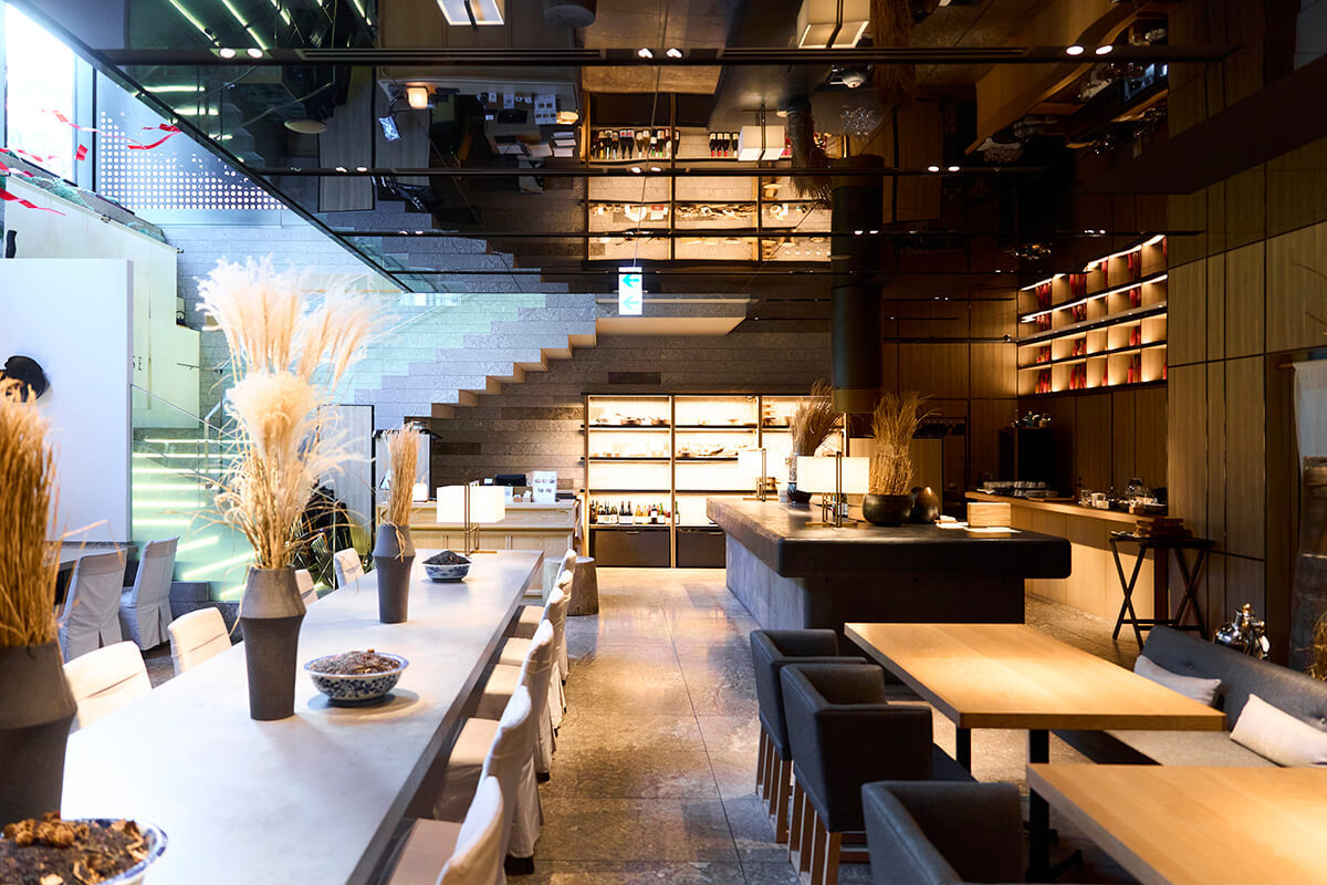 店内は「和モダン」という言葉がふさわしい、都会的なインテリアの内装。地下へ降りる階段には大きな窓があり、自然光が降り注ぎます。天井が鏡張りになっているため、開放的にも感じる空間です。とはいえ地下にあるため朝でも明るすぎず、上質なムードも感じられます。