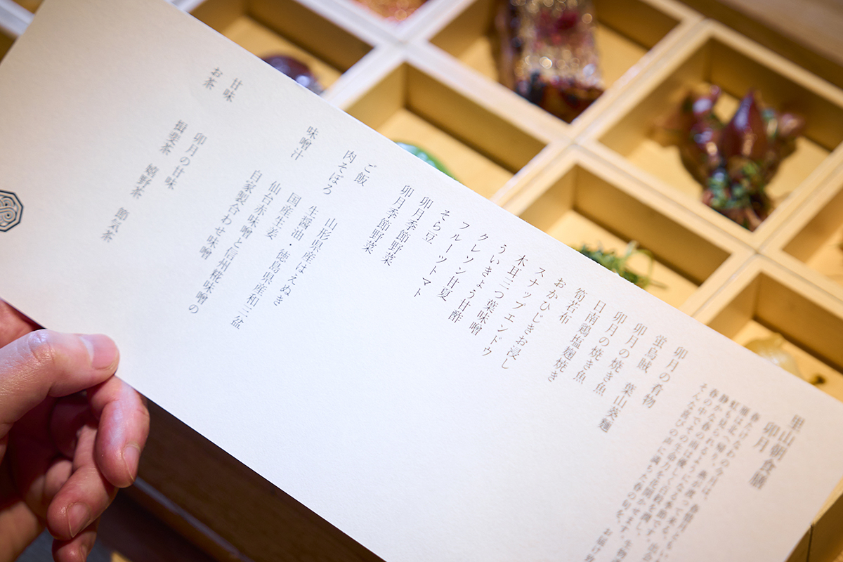 着席したら、既に料理のお品書きが置かれていました。まるで旅館での朝食みたい! 旅気分で胸が高鳴ります。取材時は、春の旬を存分に感じられる「卯月」のメニューでした。