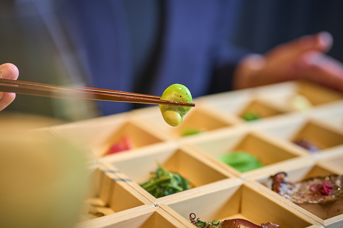 前菜の到着とともに、どんな野菜が使われているかを説明してもらえます。調理される前の野菜の姿を見ることで、より自然の恵みをありがたく感じながら食べられるというわけです。佐賀県のホワイトアスパラガス、菜の花、タケノコ、チコリ……。早速お品書きを見ながら味を確認しつつ、ひとつひとつを丁寧に食べていきましょう!