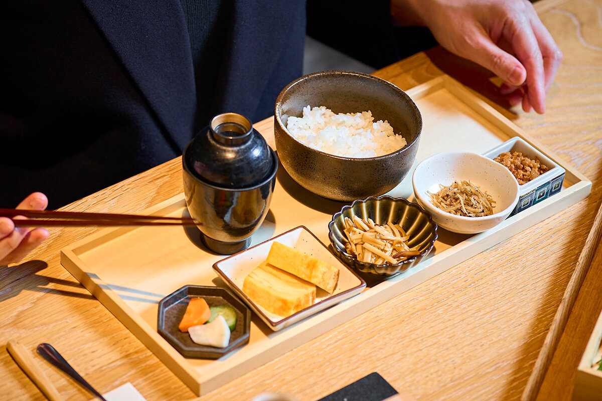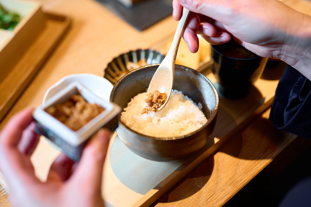 前菜を楽しんでいると、ご飯セットが到着してまた気持ちが高鳴ります! 粒が立っていて見るからにおいしそうなお米は、山形県産「はえぬき」を使用。味噌汁は、仙台赤味噌と信州糀味噌の自家製合わせ味噌です。