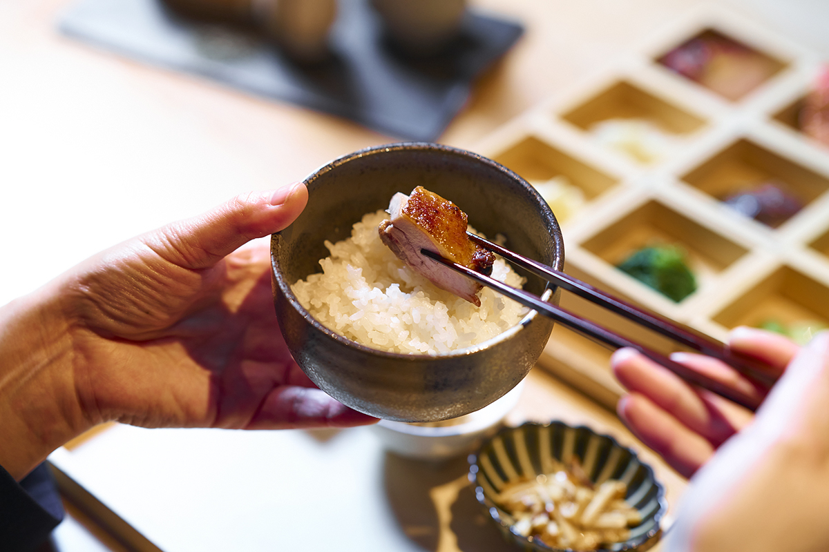 定番の日南鶏も「はえぬき」のほかほか炊きたてご飯に合う! ひと口サイズだから、たくさんのおかずがあってもちょうどよく楽しめます。