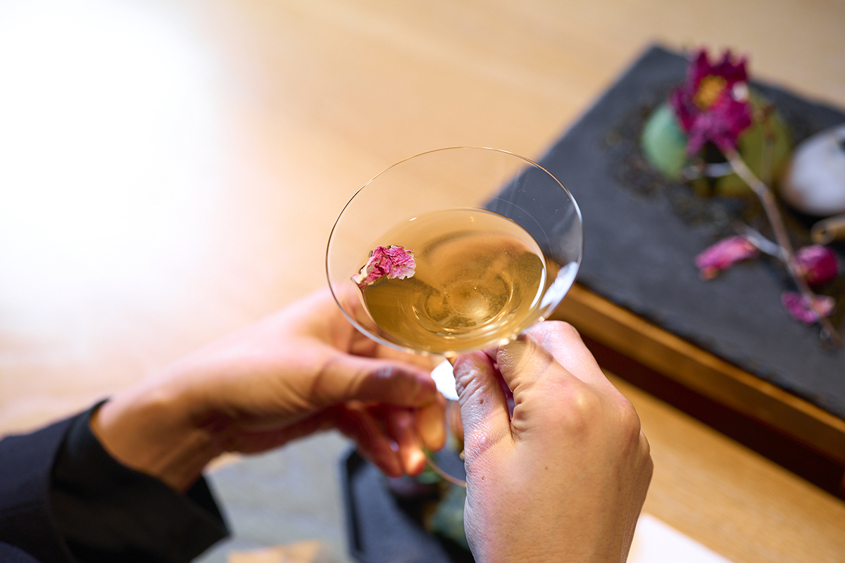 お茶は、二十四節気をイメージしたオリジナルの「節気茶」。こちらも月替わりで、今回は牡丹の花のお茶です。食事のタイミングに合わせてお茶が3種類いただけるのも、とてもぜいたくです。