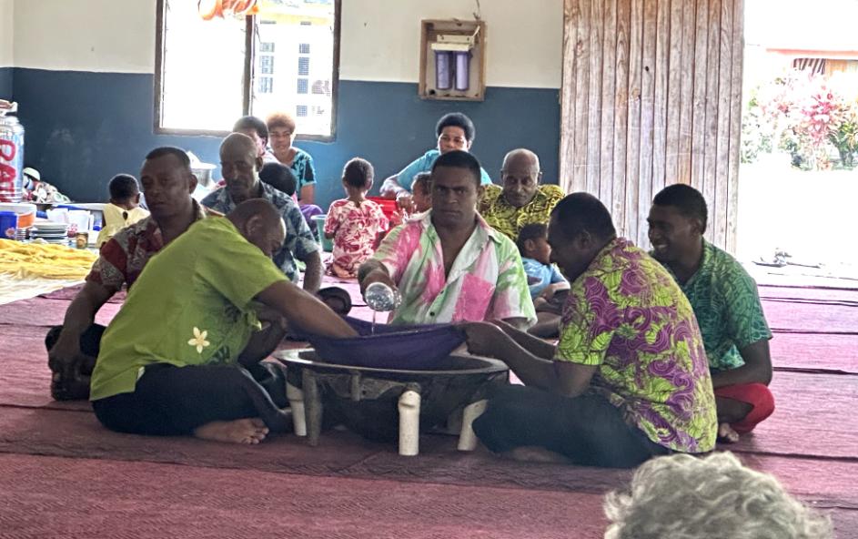 集会所に案内され、来訪者を歓迎するカバの儀式が始まります。カバは、胡椒科の木の根を濡らし、水で漉したフィジーの伝統的な飲み物。
