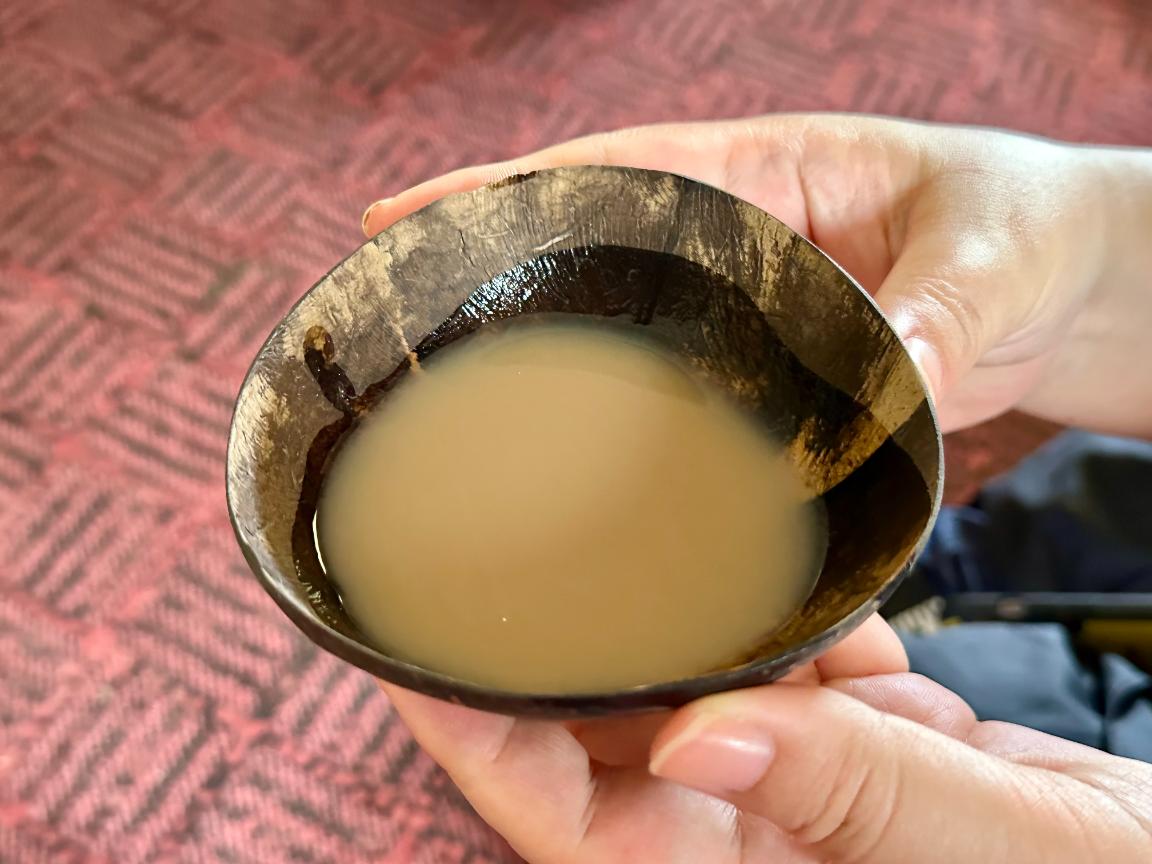 ココナッツの殻で作ったビロとよばれる器にカバを注いでもらったら、1回手をたたき、一気に飲み干し、そのあと3回手をたたきます。泥水のようで一瞬たじろぎますが、味はやや漢方っぽい感じで飲めなくはありません。これで私も村人の仲間入り!!