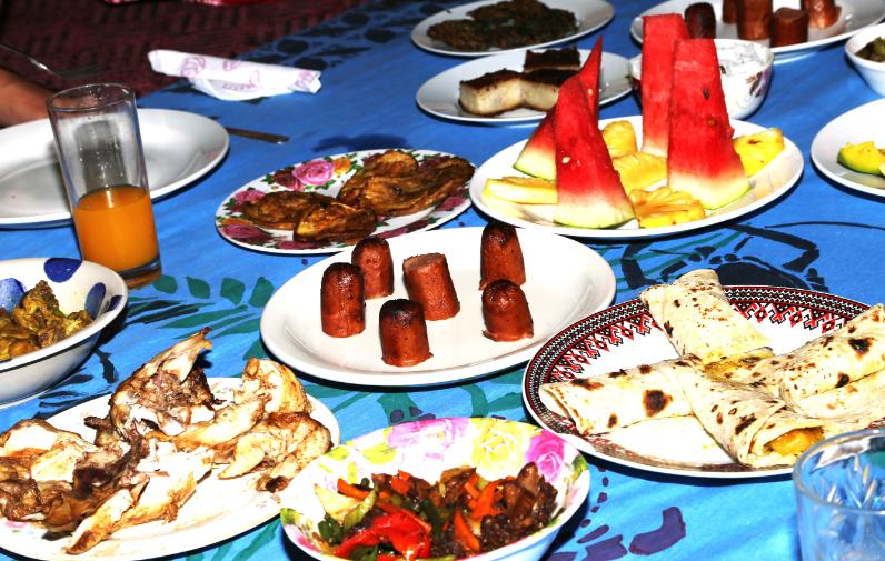 カバの儀式が終わったら、村の人たちが作った茹でたキャッサバ芋や、野菜の炒め物、鶏肉料理、ロティとよばれる薄いパンなど家庭料理が振舞われます。