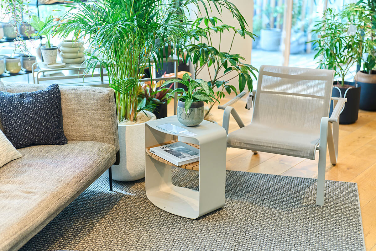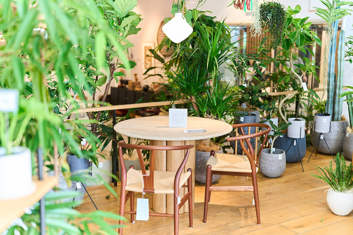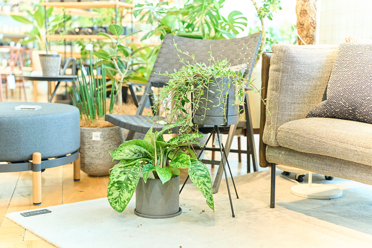 インテリアと一緒に置いたときのイメージがしやすいように、店内にはダイニングテーブルやソファなども置かれています。スタッフに部屋の写真を見せながらどんなグリーンが合うのかを相談するのもいいですね。