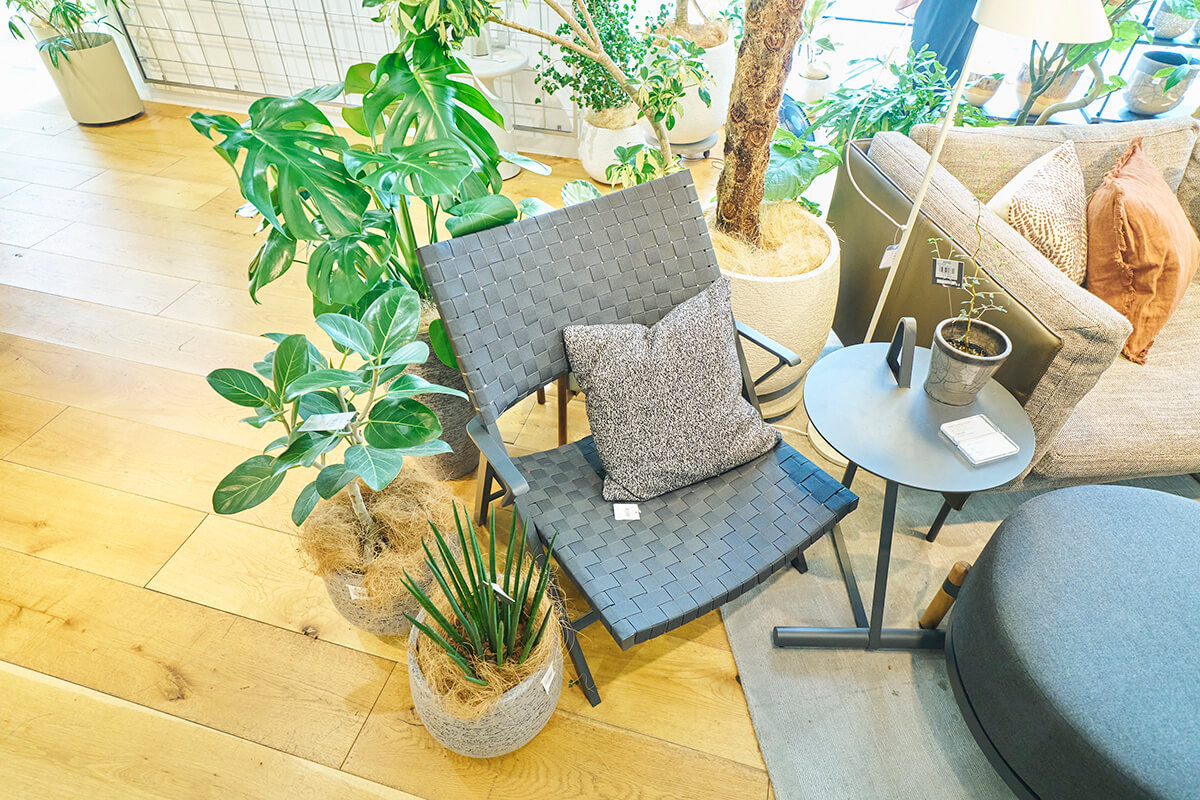 家でのリラックスタイムはソファに座っていることが多いはず。そこでソファに座ったときの目線でグリーンがどう見えるかをチェックできるように、ソファも置いてあります。広い店舗内で見るとそこまで大きく見えないグリーンでも、部屋に置いたらかなり大きい……という失敗も。だからこそ家具と一緒に並んでいると、イメージしやすい!