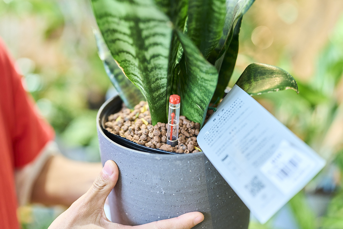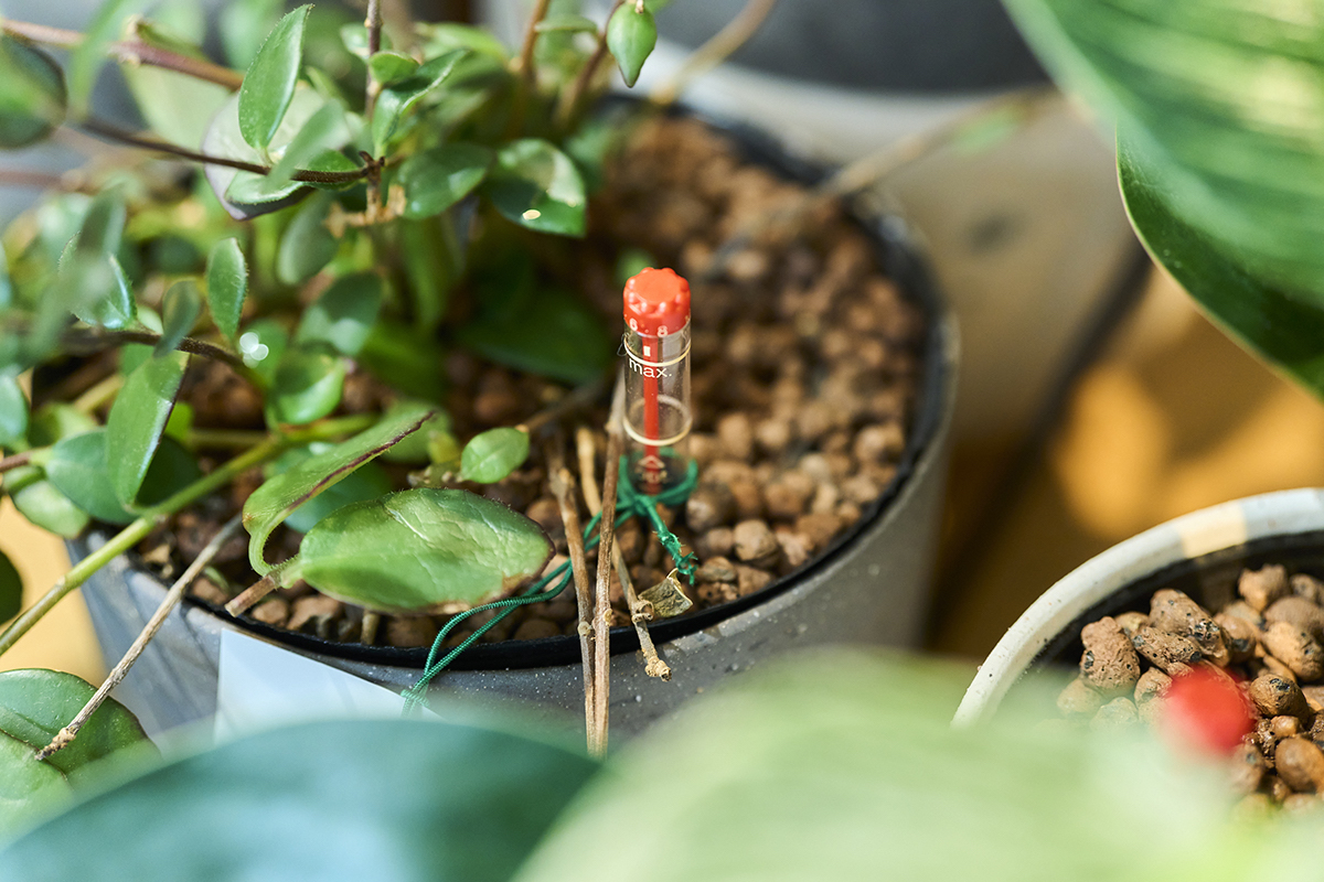 中が浮きになっていて、溜まってくる水で浮いてくる仕組み。感覚ではなく目で見て水やりのタイミングが分かるため、枯らしてしまうリスクを圧倒的に減らせます。この水位計の取り扱いは、国内では「ノードリウム・東京」だけだそう。