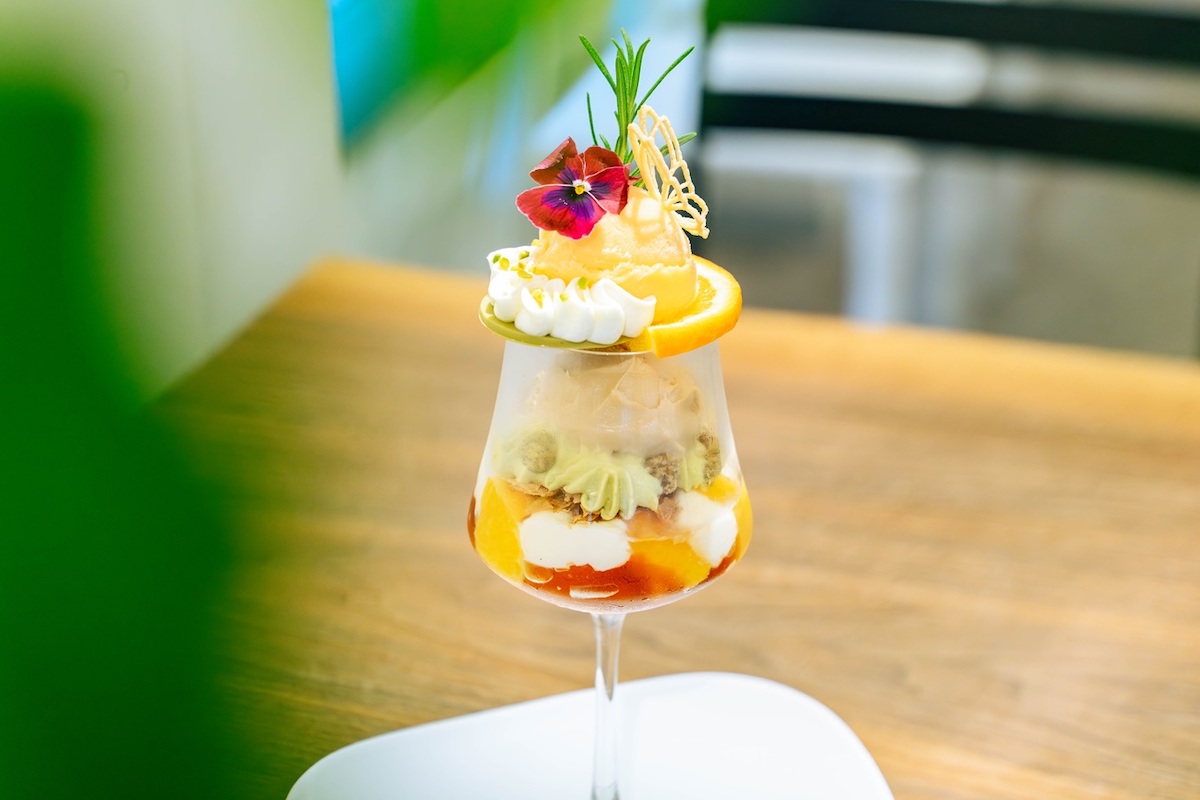 取材時の4月のパフェは、「オレンジ&ピスタチオ ティーパフェ」2300円。フレッシュなネーブルオレンジをベースに、アールグレイのジュレや白ワインのグラニテ、チーズ入りクランブル、オレンジのチュイールなど、多彩なスイーツが入っています。