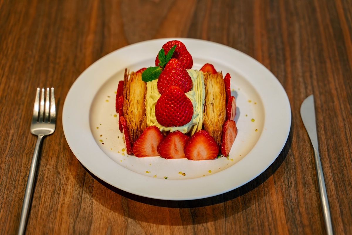 自家製パイ生地の作りたてミルフィーユも評判です。こちらもパフェと同じく月ごとに新しい味わいが楽しめ、4月は写真の「いちごのミルフィーユ」2100円がお目見え。たっぷりのピスタチオクリームとともにいただきます。なお、5月は「宇治抹茶と苺大福のミルフィーユ」を予定しています。
