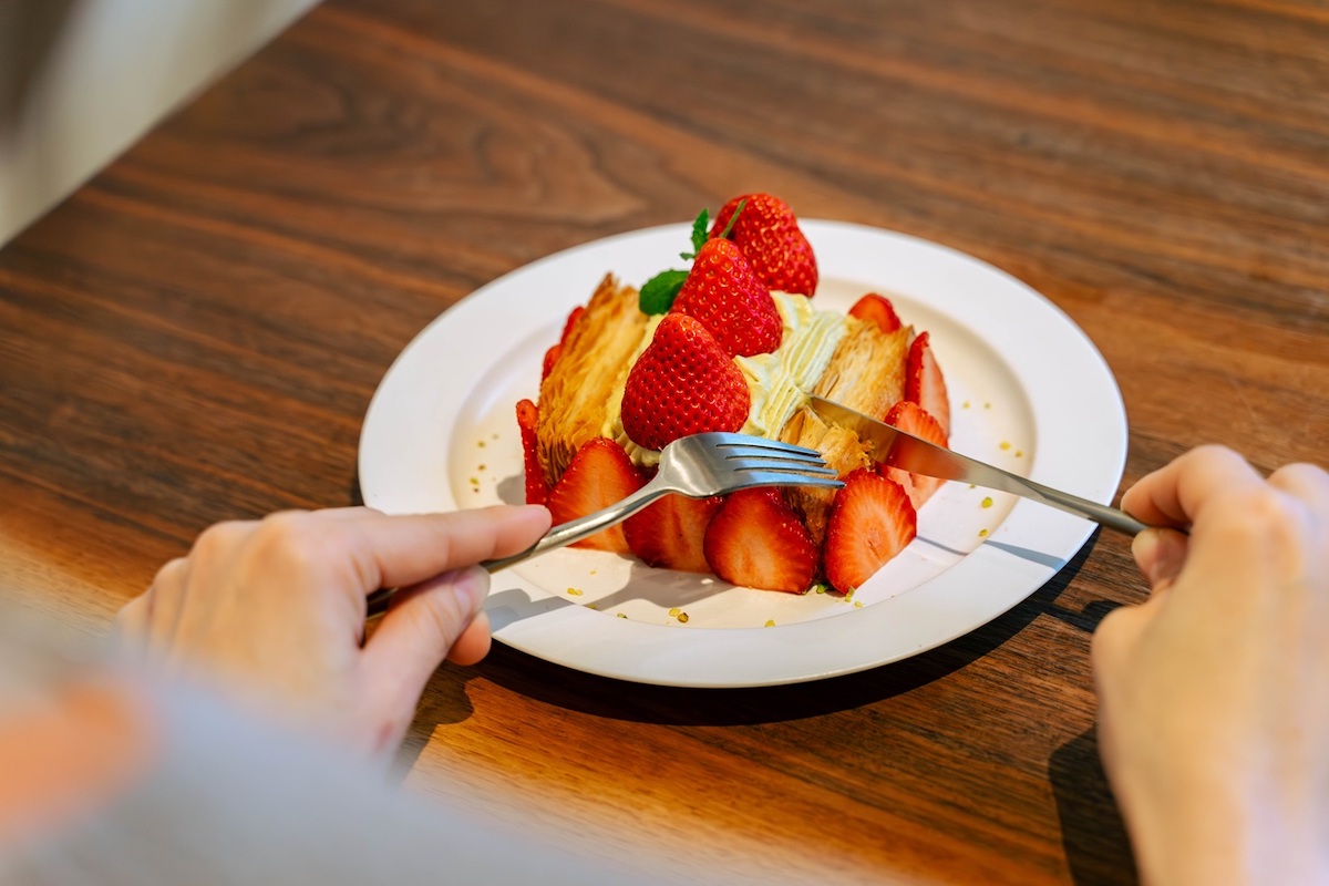 何よりおいしいのが、このパイ生地! 作りたてで提供されるためパイ1枚1枚がこれでもかというほどサクサクで、噛み締めるごとにバターの香りがふんわり漂います。国産イチゴの甘酸っぱさと、ピスタチオクリームのコク深い風味も堪能しつつ、あっという間にペロリです。