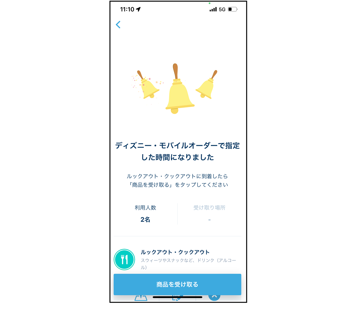 プッシュ通知で「指定した時間になりました」とお知らせがくるので、利用する全員で来店し、レストラン入口でキャストに人数確認をしてもらいます。画面下にある「商品を受け取る」をタップ(商品を受け取るボタンを押すと決済されるので、メニューの変更、キャンセルができなくなるので注意)。メニューができあがるまでに座席の確保を。
