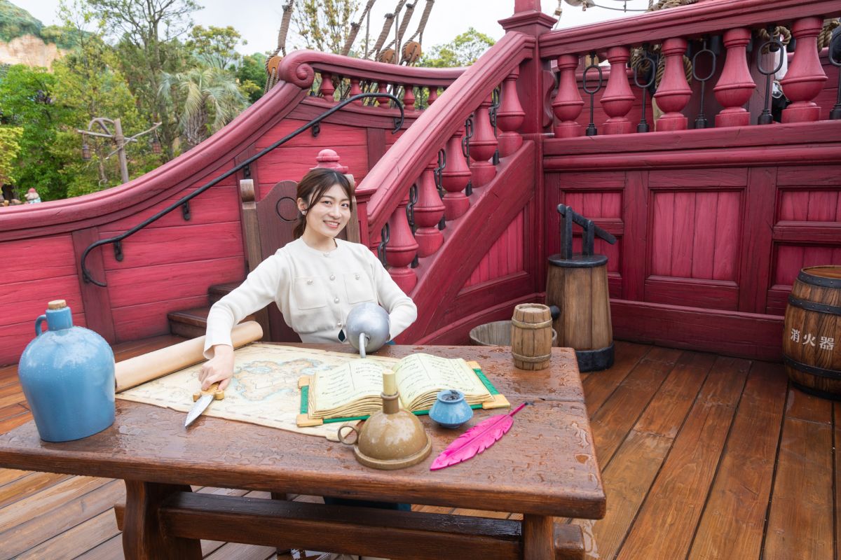 フック船長の海賊船では、机が置いてあり、実際に椅子に座って撮影も可能。