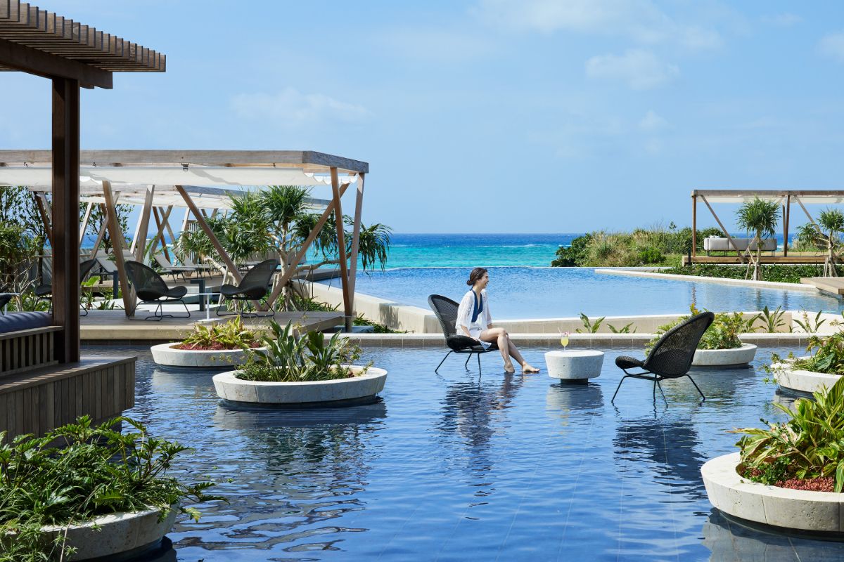 そんな「星のや沖縄」には、海に向かって突き出すように造られたインフィニティプールがあり、⽔深の異なるエリアをパズルのように組み合わせているのが大きな特徴。深さ10㎝の⽔盤のようなエリアでは⽔着を着ることなく気軽に⽔と戯れることができるのだそう。