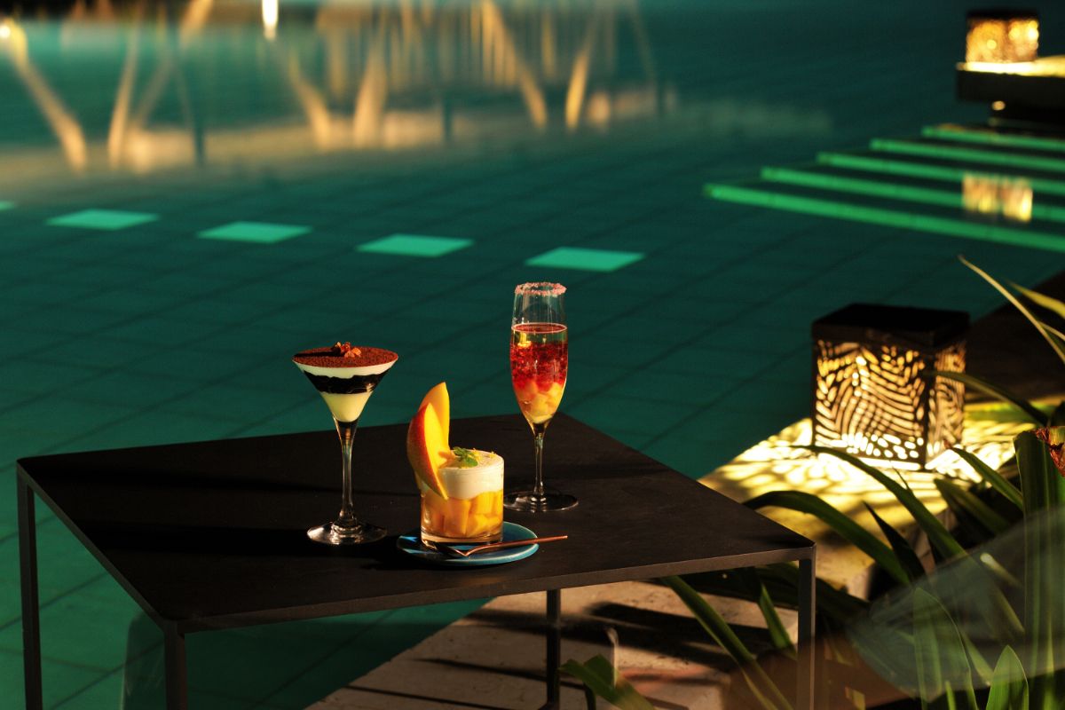 ⾷後の余韻に浸りながら、プールサイドで夏の夜を涼やかに過ごす贅沢なひとときです。