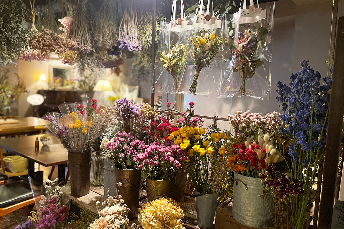 ダウンライトの落ち着いた店内には、天井やテーブルの上など、至る所にドライフラワーが。店内にあるドライフラワーの種類はなんと50以上。ひとたびお店に入れば一気に「Lecoin」の世界観に引き込まれます。