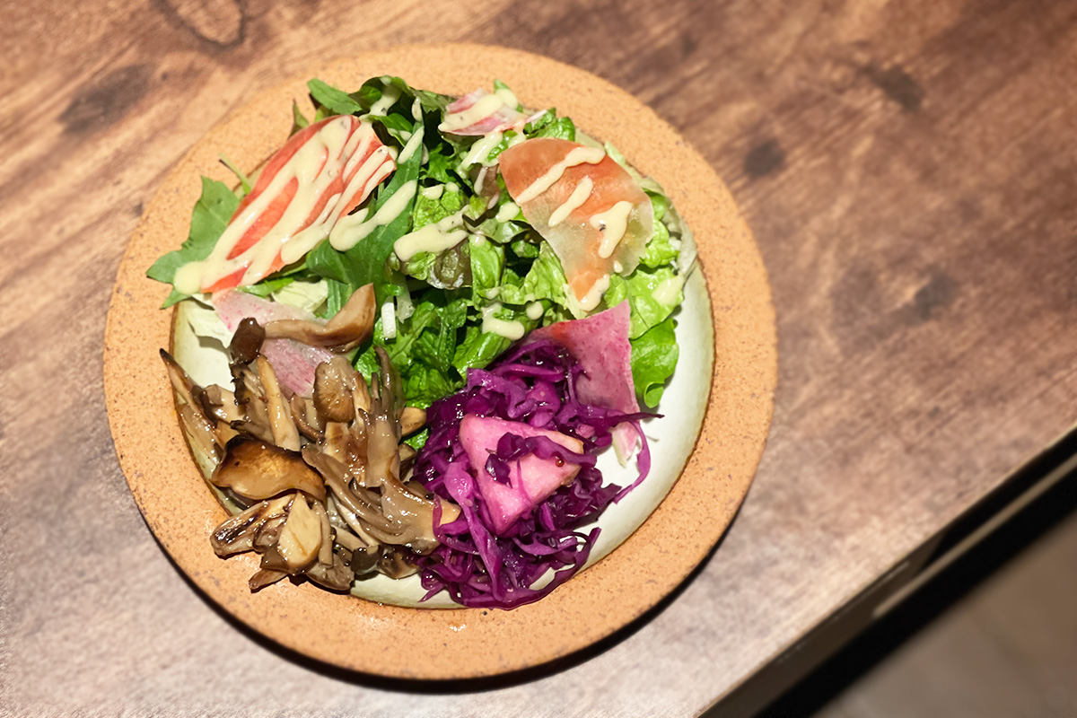 サラダには自家製のドレッシングが。マスタードのほんのりピリっとした味わいがアクセントになっていて、みずみずしい野菜との相性も抜群。