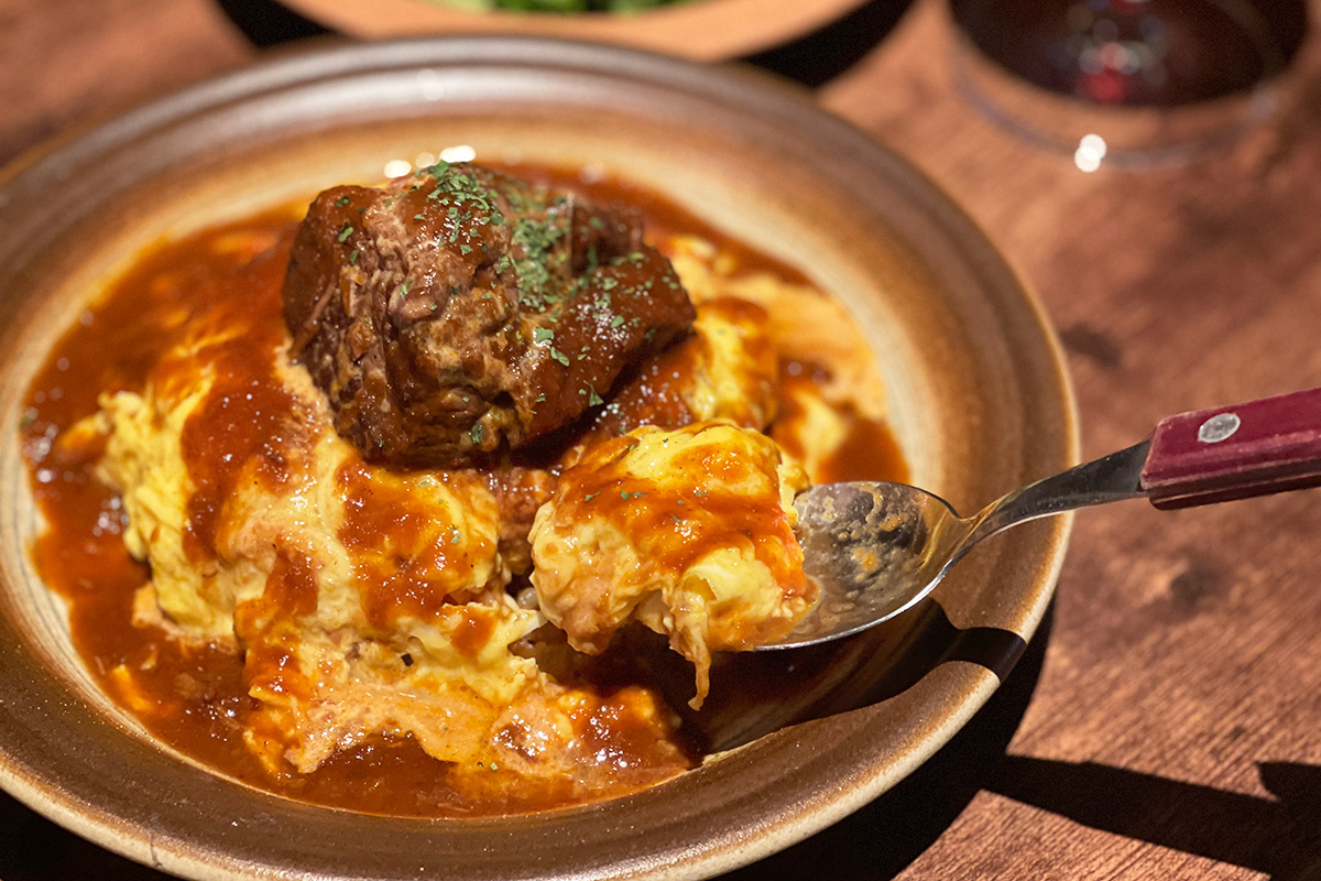 牛肉のデミグラスソースは、赤ワインなどを使用し、3〜4時間かけてじっくりと煮込んでいるので味わいは奥深く、牛肉はホロホロの食感!半熟の玉子やケチャップライスともよく絡んで、たまらないおいしさです。こだわりのひと品をぜひ堪能してみてください。
