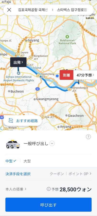クレジットカード登録なしで呼び出せる一般タクシーの場合は、タクシーの中で決済します。一般タクシーを押して、上の写真の一番下にある「呼び出す」を押すと、周辺にいるタクシーを探してくれます。その際、すぐに見つかることもありますが、5分くらい時間がかかったり、周辺にいないこともあるので、時間に余裕をもって利用してください。また、移動予想時間も地図上に表示してあり、地図上にある青い線は、予想経路を表示しているので安心です。呼び出しボタンの上には、予想金額「2万8500ウォン」も表示されます。あくまで予想ですが、通常数千ウォン前後の差額が一般的です。