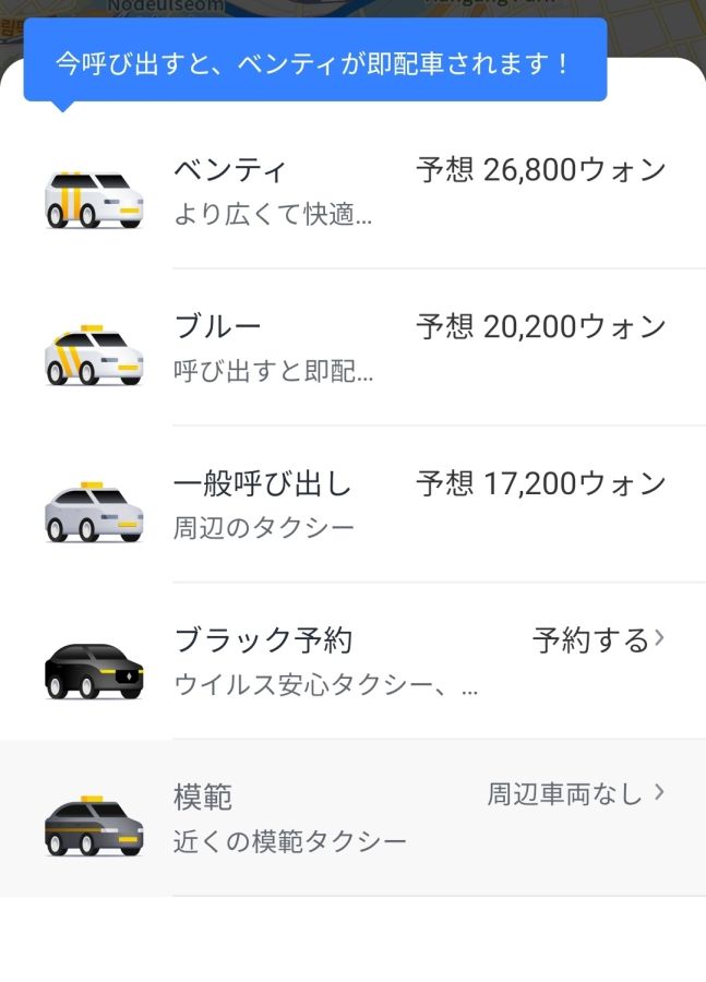 呼び出すと即配車されるタクシーで急ぎの人にオススメです。基本料金3000ウォン。