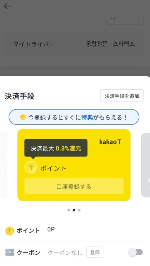 配車予約機能や一般タクシー以外のタクシーを利用したい場合には、カード登録が必須です。海外カードも登録できるようになっていますので、ガイダンスに従って登録していくと、予約完了となります。クレジットカードを登録したい場合には、黄色カードの右上にある「決済手段を追加」というアイコンをクリックすると、