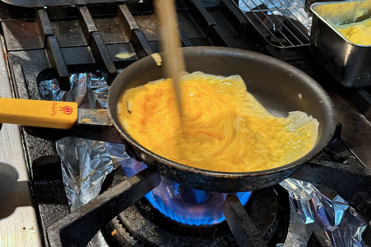 新鮮な卵に生クリームなどを合わせた卵液を、オムプロさんがプロデュースしたオムライス専用フライパン「オムプロパン」で焼き上げます。
