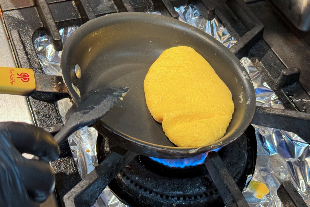 オムプロパンは、熱伝導に優れていて、きれいな形のオムレツが作れるよう、工夫されているのだとか。
