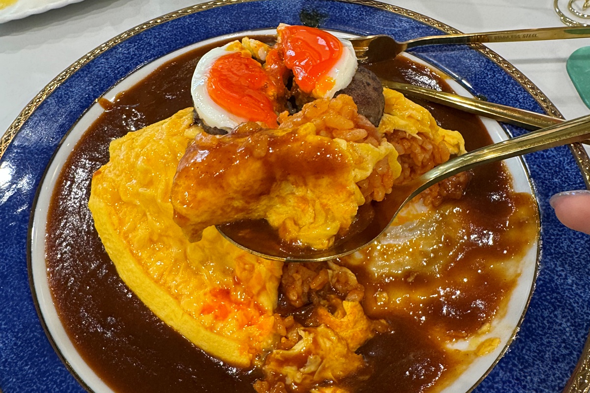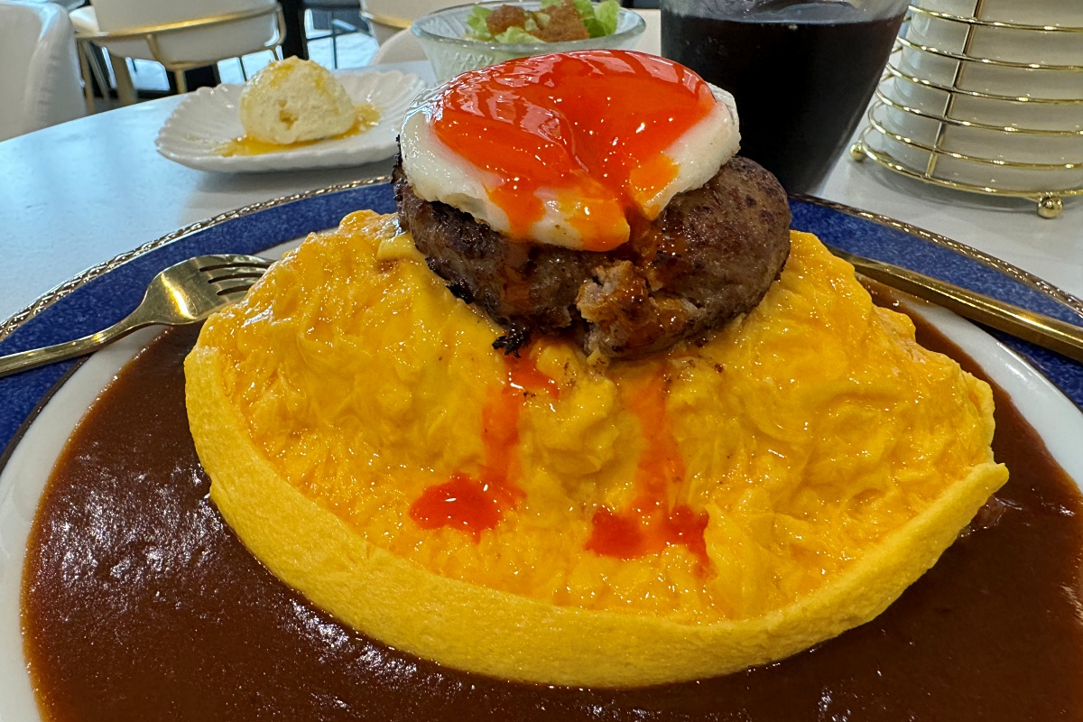 とろとろ、ふわふわのオムレツに、ベーコンのうま味が凝縮されたケチャップライス、濃厚デミグラスソース、さらにジューシーなハンバーグ…まるで“大人のためのお子さまランチ”のようなぜいたくさ。