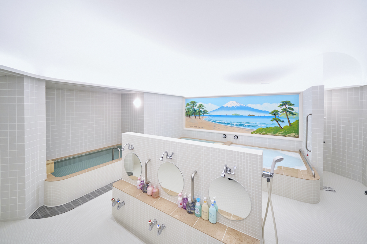 男湯と女湯はほぼ同じ大きさと形。どちらにも、日本に2人しかいないという銭湯絵師によって、壁一面に富士山のペンキ絵が描かれています。