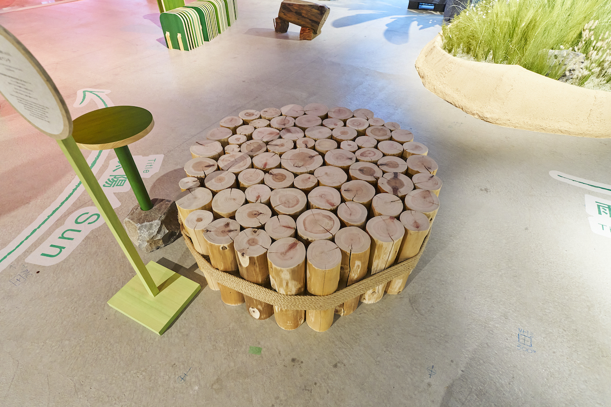 丸太ベンチは、多摩市の森の間伐材を円形に並べて束ねたもの。ハラッパで使った後は、材木やバイオマスの材料として使用されるそうです。