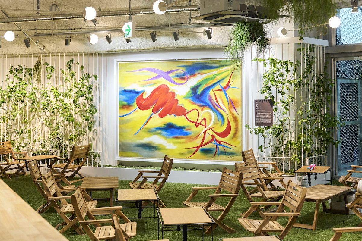 「神宮前の交差点でゆったりしよう」をテーマにした6階には芝生ゾーンがあり、室内にいながらアウトドアのような雰囲気。階の飲食店で購入した料理をここで食べることができます。芸術家の岡本太郎氏が昭和36年(1961)に描いた絵画『夢』も展示されていますよ。